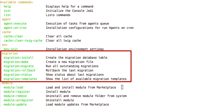 Библиотека миграций предоставляет перечень следующих команд: install, make, migrate, rollback, templates, status. Каждая команда выполнена с помощью Symfony Console Component. В console-jedi я хотел видеть эти команды в отдельном пространстве имен, чтобы не путать с командами самого console-jedi. Сказано - сделано.