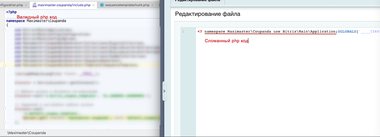 Была еще одна тонкость. Поскольку решение я сделал платным, то потребовалось вынести часть логики в файл include.php и сделать демо-режим. В этом режиме содержимое данного файла обфусцируется с целью защиты. При тестировании выяснилось, что обфускатор работает некорректно, ломая код в моем случае. В этом файле я весь свой код заключил в неймспейс, а битрикс при обфускации тоже объявляет свой неймспейс в этом файле в расчете на то, что в этом файле нет других неймспейсов и получается ошибка парсинга php. Вот так выглядел код до обфускации и после: